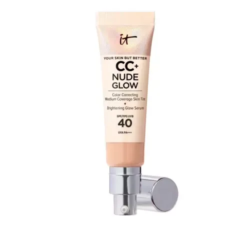 CC+ Nude Glow Color Correcting Medium Coverage Skin Tint SPF 40 od It Cosmetics má snadno roztíratelnou texturu s vysokým podílem přírodních složek. Pleť po aplikaci vypadá odpočatě, napumpovaně a svěže. Plus za vyšší UV ochranu a dlouhou výdrž. 12 odstínů. Cca 1090 Kč/32 ml.