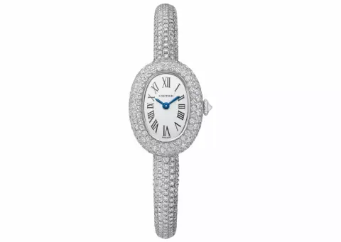 Hodinky Baignoire z bílého zlata s diamanty, celkem 5 ct, 615 000 Kč, Cartier.