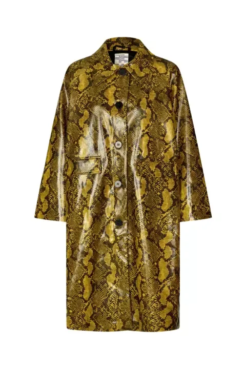 Tip z českých butiků: Polyuretanový kabát ve velikostech 34–42, cena 3 799 Kč od Baum und Pferdgarten, je důkazem, že lakovaná móda není výsadou zahraničních značek.