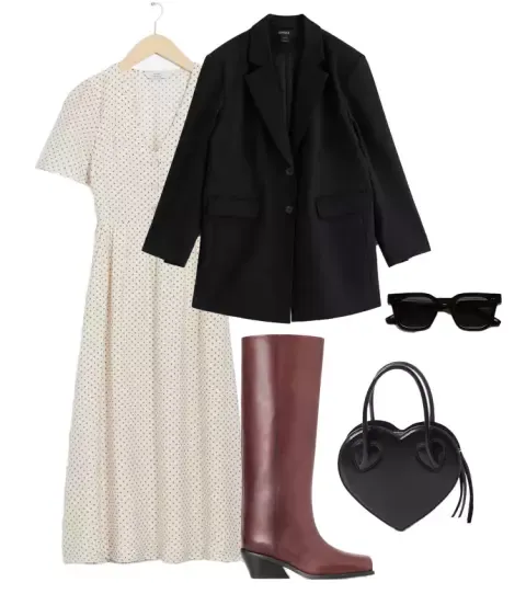 Změna nemusí být složitá: Oživte outfit i v zimě! Základ tvoří jednoduché šaty, vysoké boty a volnější sako. Stačí vsadit na vzory s puntíky a barevné doplňky – a styl, který zvedne náladu, je připravený. Komfort přitom zůstává na prvním místě.