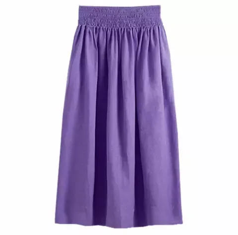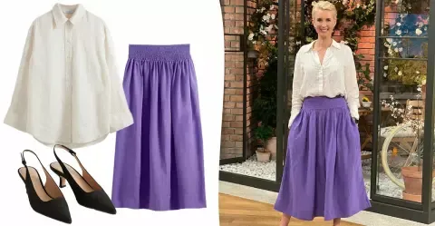 Hlavní hvězdou byla lila áčková midi sukně s výrazným, ale nápaditým žabičkováním v pase. Materiál? Viskóza, len a lyocell – tahle směs je v létě opravdový trumf. Ideálně dýchá, neslepí se k tělu a i když ve městě teploty šplhají k tropům, udrží vás v pohodě.