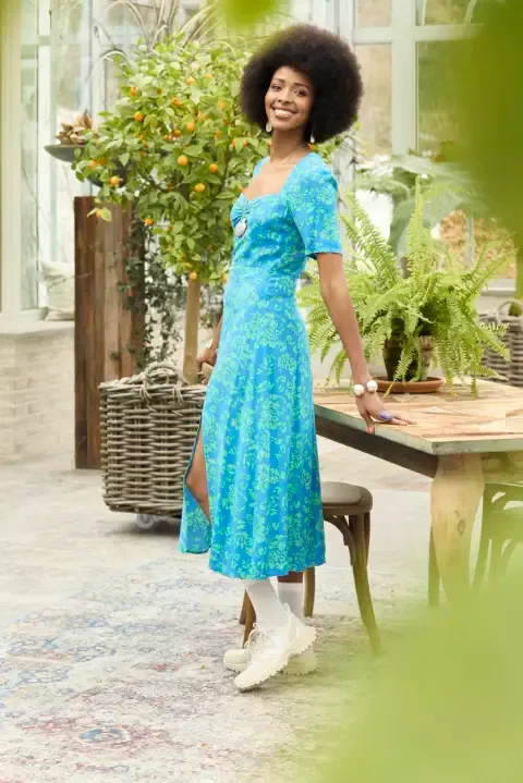 Čajové šaty s jemnými vzory využijete po celé léto – na svatby, slavnosti i příjemnou procházku. Pohodlné jsou se sneakers, pro slavnostnější příležitost oblečte sako a nízké lodičky. Doporučuji vintage šperky-přívěsky (prozkoumejte třeba pražskou burzu na Vinohradech) a pokud jde o materiál, nejlepší je certifikovaná viskóza nebo bio bavlna.