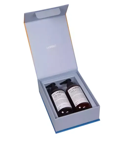 Láska k přírodě i designu: dvě plnohodnotná balení — tekuté mýdlo a tělové mléko, balené ve stylové krabičce. Oba produkty provoněné citronovou trávou a rozmarýnem působí proti stresu a krásně povzbudí náladu, i když za okny je mlha z Vltavy.