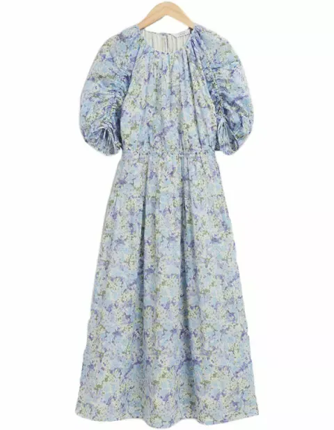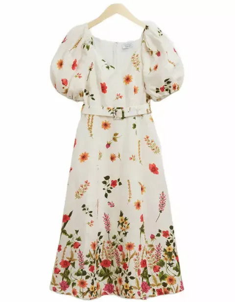 Midi lněné šaty s krátkými nabíranými rukávy, páskem v pase a jemným květovým vzorem.