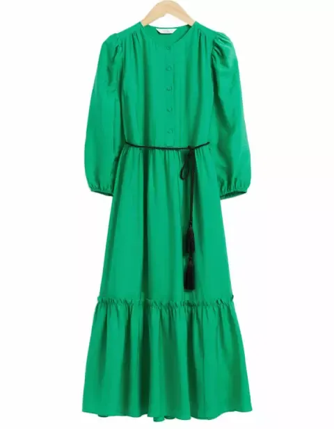 Elegantní střih, propínací knoflíky vpředu, nabírané rukávy a decentní pásek v pase – to vše jednoznačně trendy.