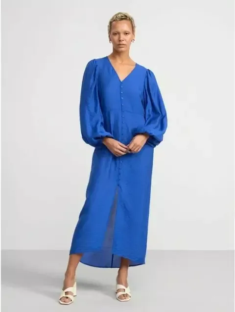Elegantní modré šaty, nabírané rukávy, knoflíky vpředu a padnoucí střih – užijete jak v práci, tak na slavnost.
