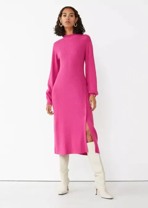 Růžové žebrované úpletové šaty, knoflíky a nízký rolák – kombinace, která zahřeje i na jaře.