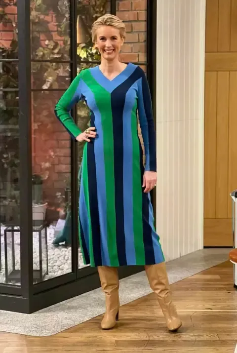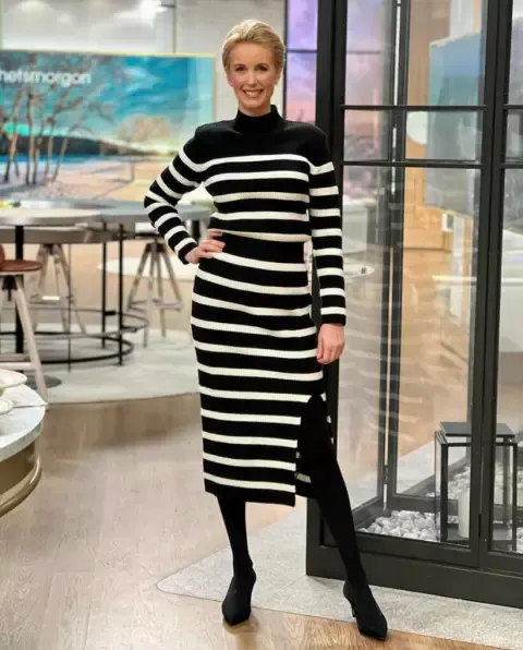 O víkendu překvapila Jenny diváky svěžím modelem s proužkovaným úpletem a výstřihem do V v pořadu Nyhetsmorgon.