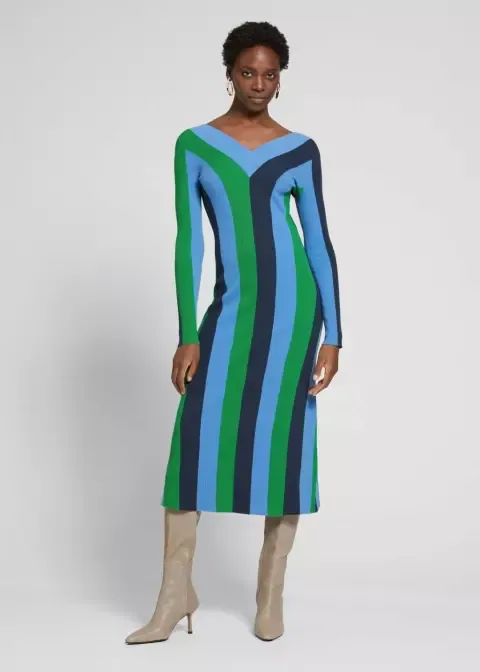 Úpletové šaty s dlouhým rukávem, vypasovaný tvar, výrazný pruhovaný design. Ideální tip pro každého, kdo má rád pohodlí i styl.
