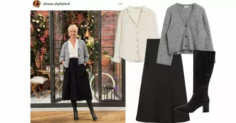 Základem outfitu je černá midi sukně – absolutní stálice letošní základní garderoby. Midi délku oceníte nejen kvůli eleganci, ale i praktičnosti v sychravém podzimním počasí. Jenny k ní zvolila bílou košili a jako bonus přidala šedý kardigan. Výsledek? Všestranný outfit, který je stále dostatečně pohodlný na celý den.